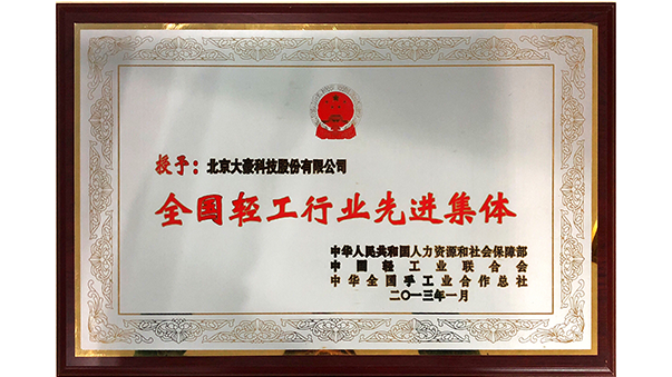 大豪公司被人社部、中国轻工业联合会、中华全国手工业合作总社评为“全国轻工行业“先进集体”