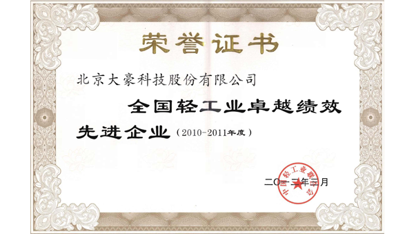大豪公司被中国轻工业联合会评为“全国轻工业卓越绩效先进企业”
