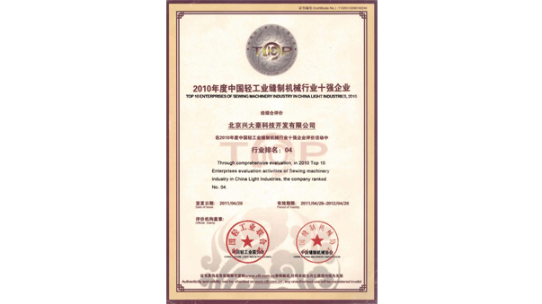 大豪公司荣获“中国轻工业缝制机械行业十强企业”