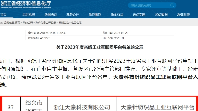 2024.03.01近日,根据《浙江省经济和信息化厅关于组织开展2023年度省级工业互联网平台申报工作的通知》,在企业自主申报、各设区市经信主管部门推荐、专家评审等基础上,经研究审核,确定2023年省级工业互联网平台名单,大豪科技针纺织品工业互联网平台入选。2023年,大豪智能工厂云平台在刺绣、袜业、手套、横机编织四大领域深入实践应用,助力行业数字化转型升级。工业互联网是互联网与工业深度融合的产物,通过人、机、料、法、环、测、