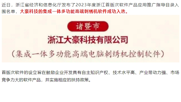 2024.03.01近日,浙江省经济和信息化厅发布了2023年度浙江首版次软件产品应用推广指导目录入围名单,大豪科技的集成一体多功能高端刺绣机软件成功入选。首版次软件的设立旨在鼓励企业开发具有自主知识产权、技术水平高、产业带动力强、市场竞争力大的软件产品,并实施相应的扶持政策。END撰 稿|编 辑:邢京伟责 编:李 亮